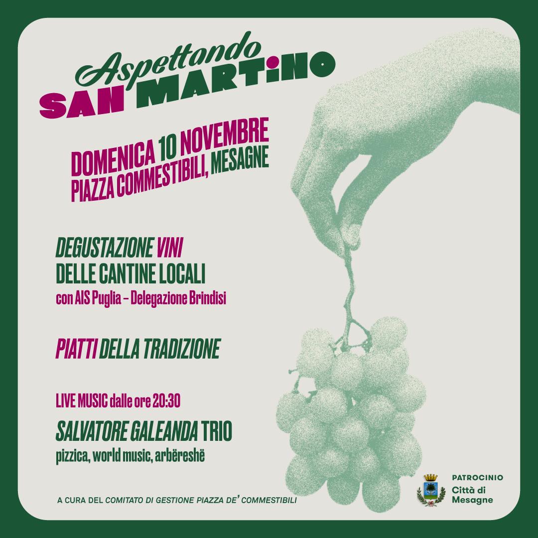 Organizzato dal Comitato di Gestione della Piazza, insieme alle attività della Piazza Commestibili e con il patrocinio del Comune di Mesagne, a partire dalle ore 20:00, l’evento celebrerà la tradizione enogastronomica con una selezione dei migliori vini delle aziende locali raccontati dai sommelier di AIS Puglia - delegazione Brindisi. I visitatori potranno gustare prodotti tipici che esaltano i sapori del territorio. Alle 20:30 la serata si accenderà con la musica dal vivo del Salvatore Galeanda Trio, per una fusione esplosiva di pizzica, sonorità arbëreshë e ritmi World Music. Con melodie che intrecciano radici e innovazione, il trio trasporterà il pubblico in un viaggio musicale vibrante e indimenticabile.
