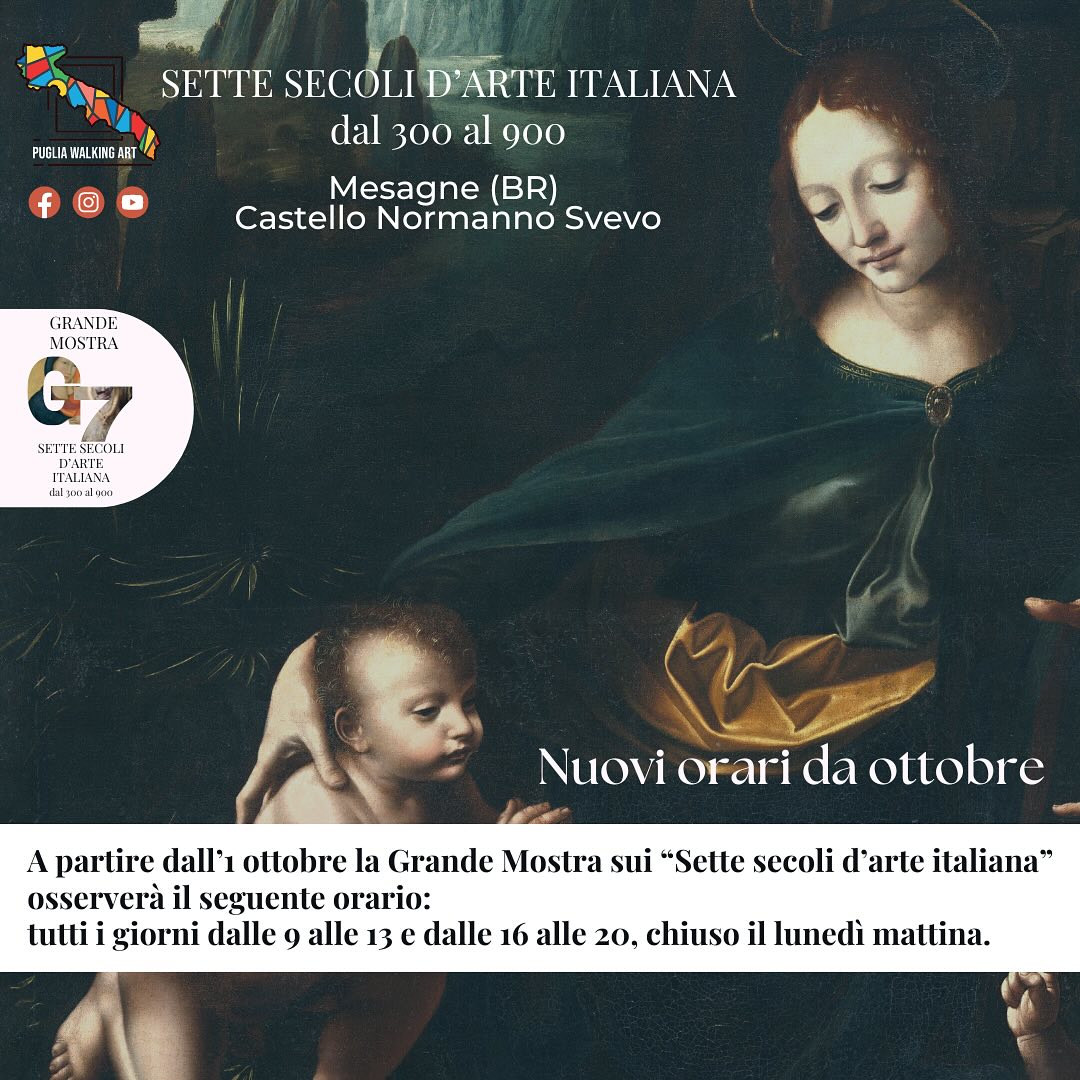 Si informano i visitatori che a partire da martedì 1° ottobre 2024 sono cambiati gli orari di apertura al pubblico del Castello comunale di Mesagne e di accesso alla mostra "Sette secoli di arte italiana" allestita al suo interno. Al Castello e alle sale della mostra si potrà accedere tutti i giorni dalle ore 09:00 alle ore 13:00 e dalle ore 16:00 alle ore 20:00; il Castello e la mostra resteranno chiusi al pubblico il lunedì mattina.