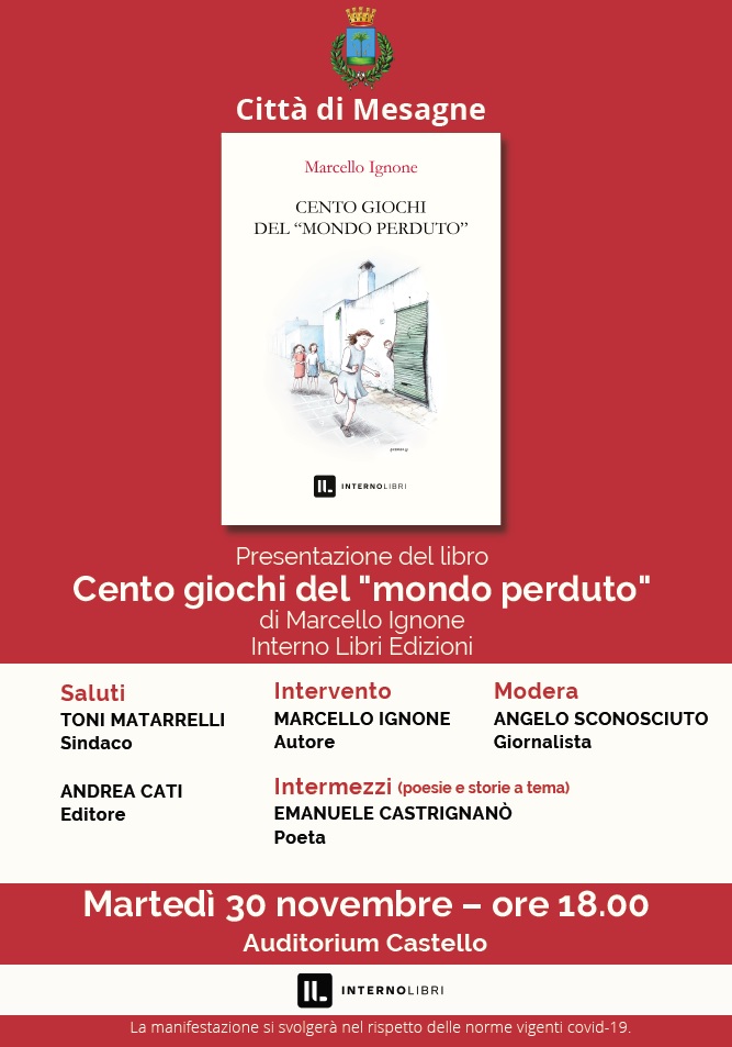 Dopo i saluti istituzionali del sindaco Antonio Matarrelli e dell’editore, Andrea Cati, l’autore dialogherà con il giornalista Angelo Sconosciuto. Il poeta mesagnese Emanuele Castrignanò interverrà con intermezzi di poesie e storie a tema. “Il regno dei ragazzi di ieri – spiega Ignone - era l’intero paese, con le periferie che si integravano con la campagna, in un periodo di grandi trasformazioni, quando l’industria di massa portò, quasi a tutti, giocattoli prefabbricati, in plastica o in latta”. L’iniziativa è patrocinata dalla città di Mesagne. Si svolgerà nel rispetto delle vigenti norme anticovid-19.