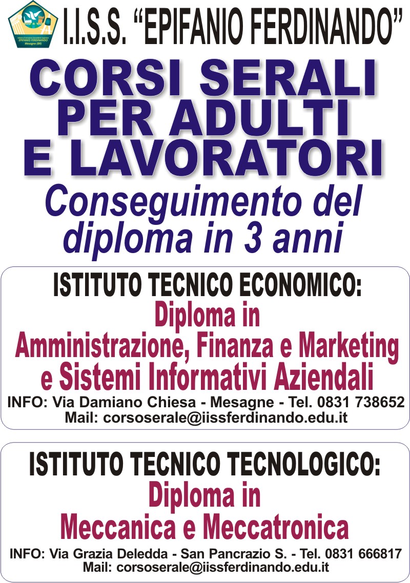 Il diploma rilasciato al termine del corso serale ha la stessa validità di quello conseguito nel corso diurno, il titolo consente quindi l’iscrizione all’università e/o l’inserimento nel settore lavorativo pubblico o privato. Per ulteriori informazioni è possibile contattare la Segreteria del Liceo in via Eschilo a Mesagne oppure inviare una e-mail a: corsoserale@iissferdinando.edu.it.