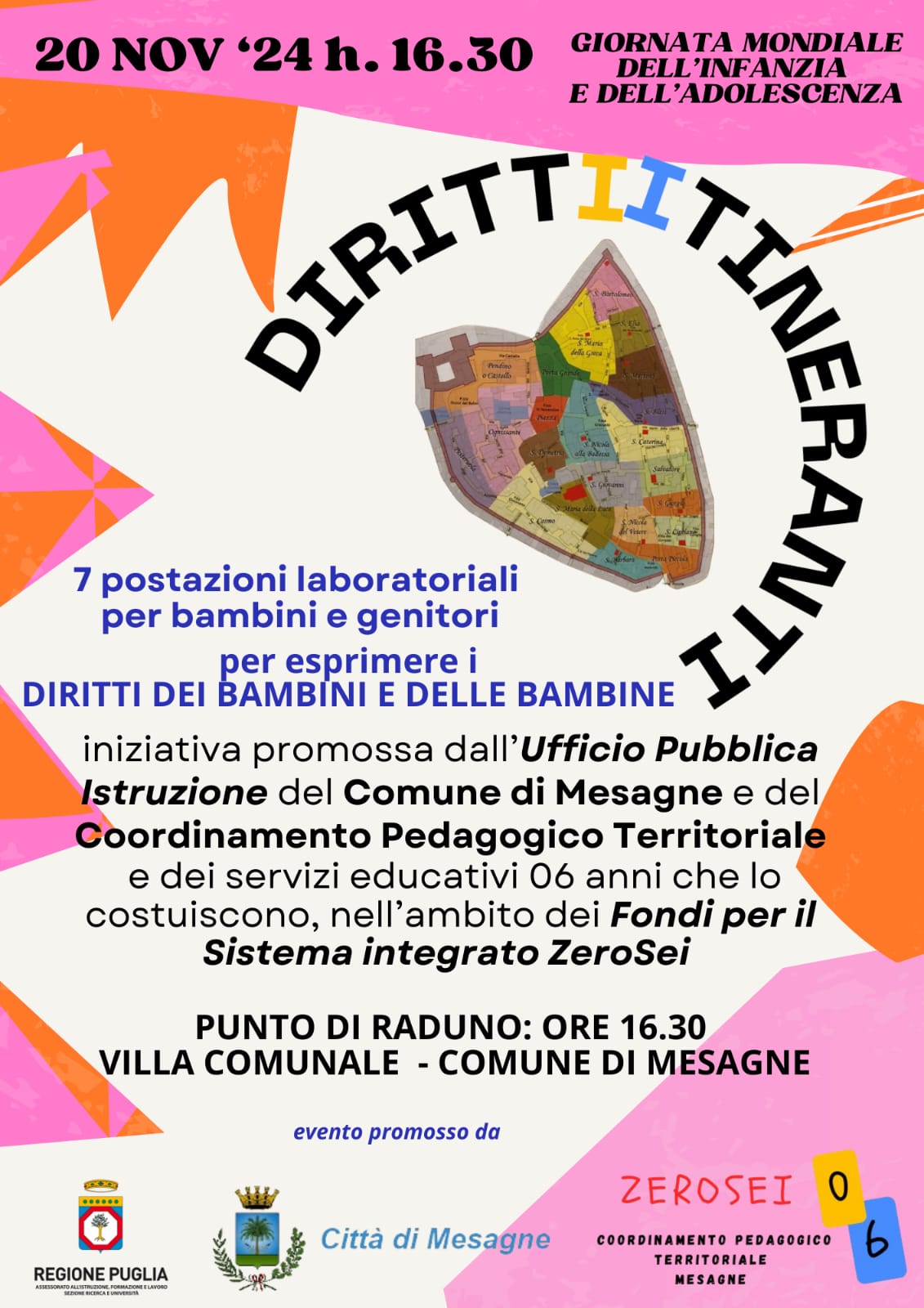 Con l’intento di rispondere alle finalità condivise, il CPT, grazie al lavoro sinergico con le scuole dell’infanzia pubbliche e private del territorio, invita a partecipare al programma ludico-laboratoriale che si svolgerà mercoledì 20 novembre, partendo dal Comune di Mesagne alle ore 16:30, organizzato per celebrare la Giornata internazionale dei diritti dell’infanzia e dell’adolescenza.