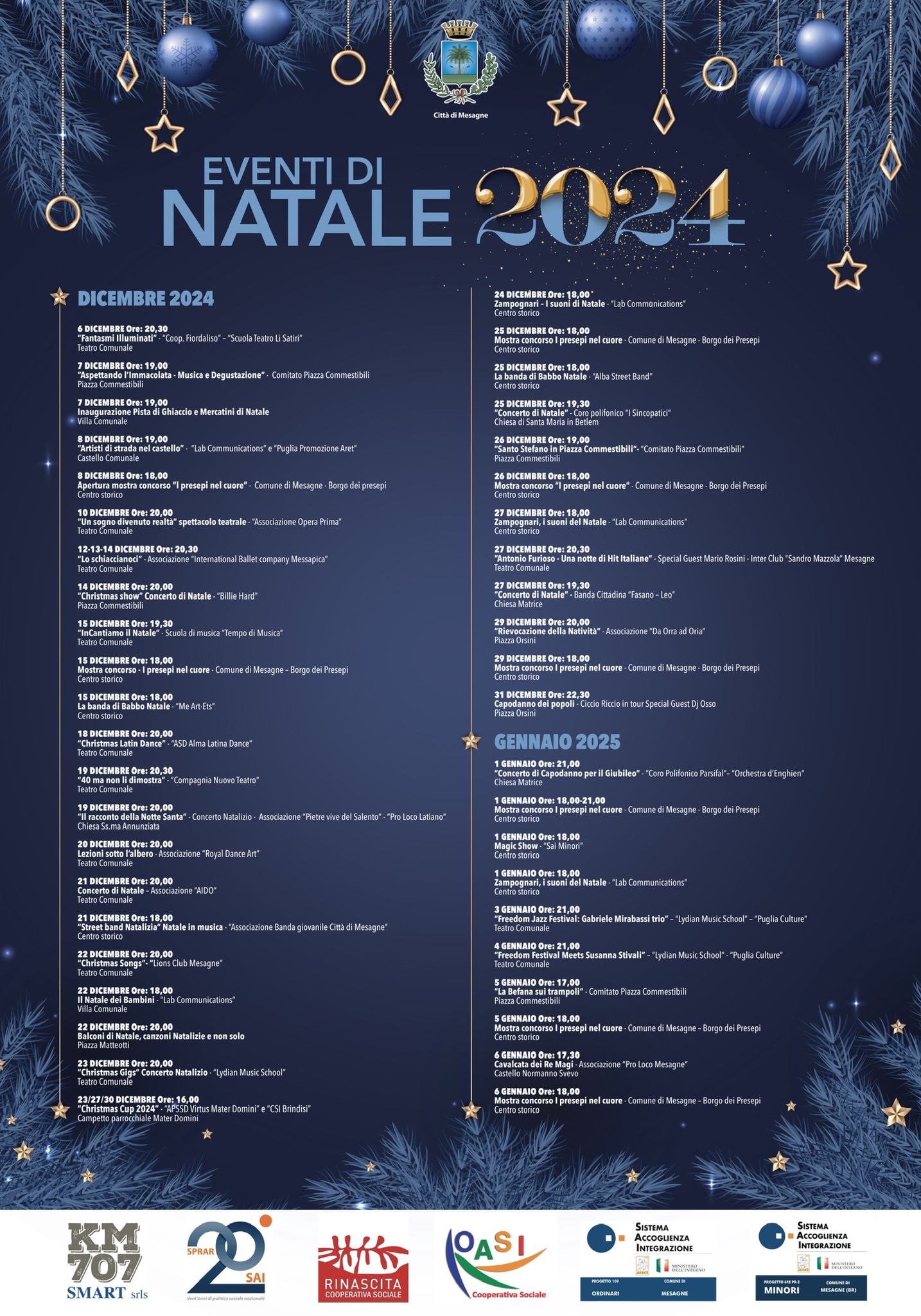 Intorno ai presepi, che torneranno con un suggestivo tour a seguito del concorso a premi organizzato con il nome di “Presepi nel cuore”, le novità sono diverse e basterà scorrere la locandina realizzata e diffusa dal Comune per cercare gli appuntamenti che più interessano. «Mesagne si prepara a vivere un Natale 2024 trasformandosi in un vero e proprio scenario natalizio di luci, suoni e colori, pensato per accogliere abitanti e turisti in un clima di festa che unisce tradizione e comunità», è stato il commento del direttore artistico della città di Mesagne, Maurizio Piro.
