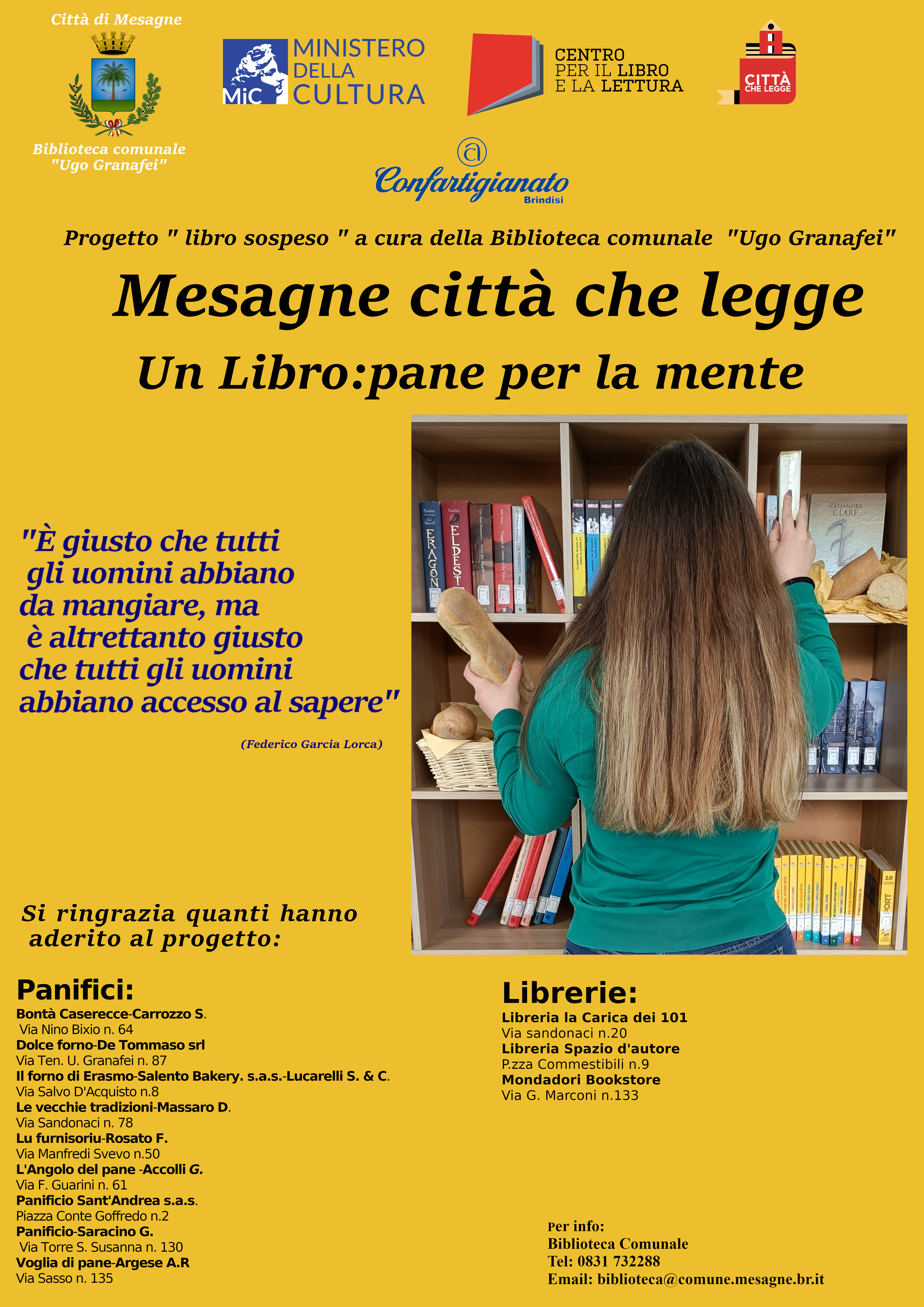 Il progetto “libro sospeso” rientra tra le attività promosse dall'Amministrazione Comunale di Mesagne nell'ambito del riconoscimento ministeriale 'Città che legge' assegnato dal Cepell - Centro per il libro e la lettura nel luglio del 2020. L'iniziativa è stata presentata in una conferenza stampa lunedì 20 dicembre alla quale hanno partecipato: Marco Calò, consulente alle Politiche Scolastiche e Culturali; Alessia Galiano, direttrice della Biblioteca Comunale “Ugo Granafei”; Teodoro Piscopiello, direttore provinciale di Confartigianato; Enzo Neve, presidente cittadino di Confartigianato. “Libro sospeso, un libro pane per la mente” si avvale della collaborazione di Confartigianato, delle librerie “La Carica dei 101”, “Lettera22” e "Libreria spazio d'autore".