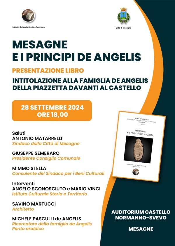 Una pagina di storia locale che merita di essere ricordata; circa un secolo di storia feudale da tramandare e che diventa titolo di un luogo pubblico a Mesagne. Sabato 28 settembre alle ore 18, nel corso della manifestazione su «Mesagne e i Principi de Angelis», l’Amministrazione comunale renderà pubblica la intitolazione alla famiglia de Angelis della piazzetta antistante al Castello comunale; a seguire, presso l'Auditorium, in collaborazione con l’Istituto culturale “Storia e Territorio” di Mesagne, si terrà la presentazione del volume che quel sodalizio ha approntato e che è inserito nella prestigiosa collana “Rara et Rariora”.Data: Venerdì, 27 Settembre 2024