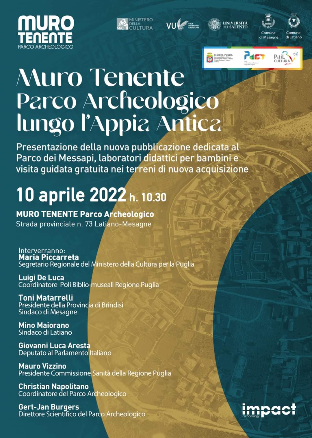 L’iniziativa sarà preceduta da laboratori didattici per bambini e da una visita guidata nei terreni di nuova acquisizione del Parco. “Muro Tenente, Parco archeologico lungo l’Appia Antica” è la nuova pubblicazione dedicata al Parco dei Messapi, situato sulla strada provinciale n.73, tra Mesagne e Latiano. Interverranno: Maria Piccarreta, segretario regionale del Ministero della Cultura per la Puglia; Toni Matarrelli, presidente della Provincia di Brindisi e sindaco di Mesagne; Mino Maiorano, sindaco di Latiano; Giovanni Luca Aresta, deputato; Mauro Vizzino, presidente della commissione Sanità della regione Puglia.