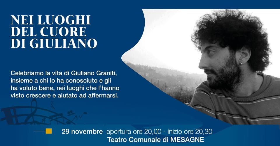 Insieme alle persone che gli hanno voluto bene, nei luoghi che lo hanno visto crescere ed aiutato ad affermarsi: venerdì 29 novembre, al Teatro comunale di Mesagne, alle ore 20, la serata per ricordare Giuliano Graniti.