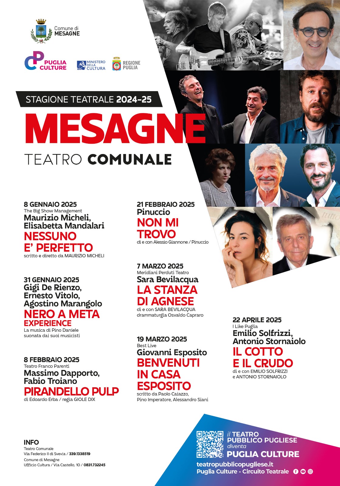 “Quello di Mesagne è un cartellone pensato per emozionare, far riflettere e divertire: il teatro si conferma ancora una volta come luogo di cultura e aggregazione. Sette gli spettacoli in programma con grandi nomi della scena italiana, giovani promesse e omaggi culturali che renderanno ogni appuntamento un’esperienza unica. Il nostro invito, come Puglia Culture, è quello di non mancare”, commenta Sante Levante, direttore di Puglia Culture.