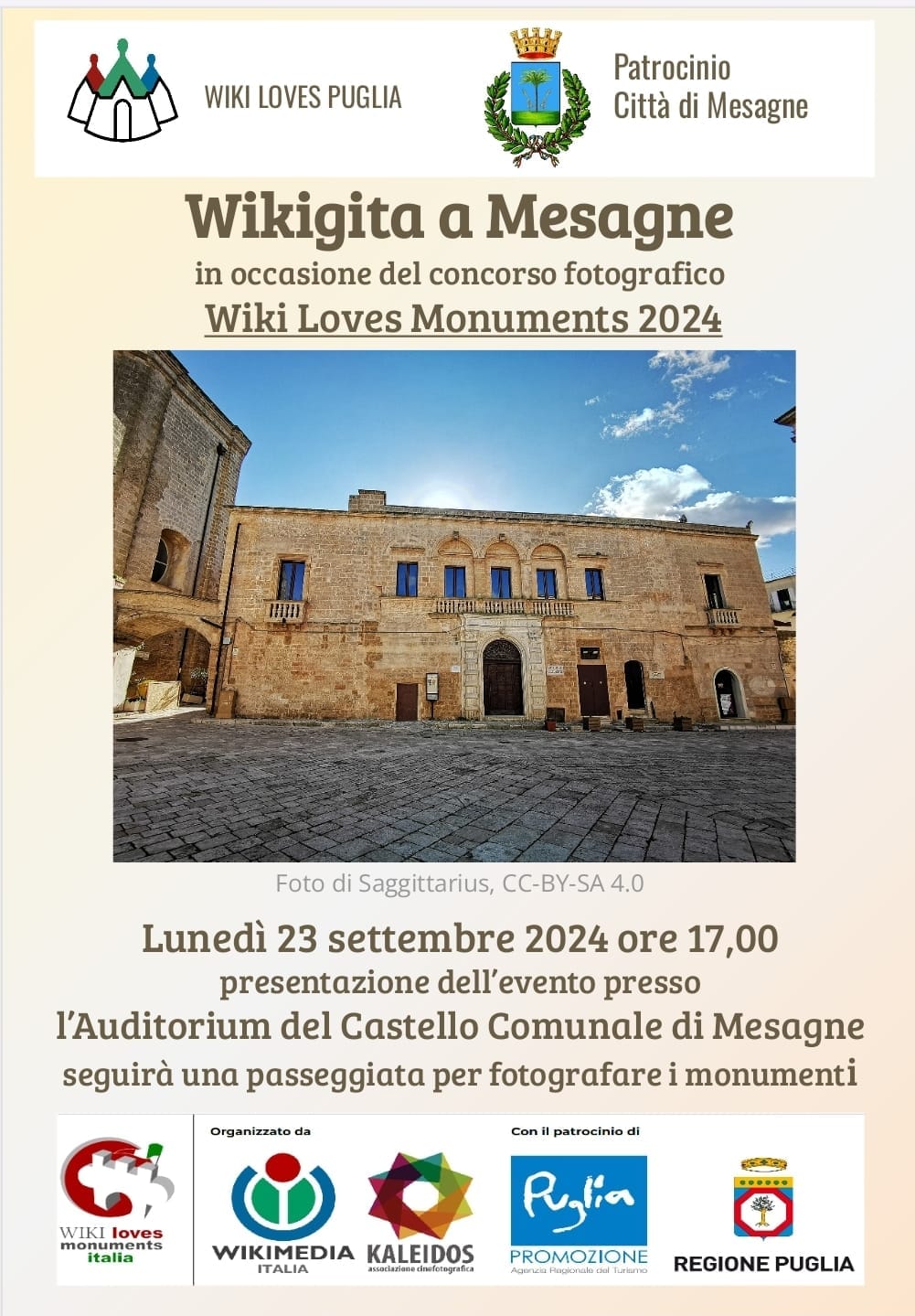 “Wiki Loves Puglia” è l’edizione regionale pugliese di “Wiki Loves Monuments”, il concorso fotografico che potenzia la visibilità dei beni culturali e invita a sentirsi protagonisti della valorizzazione e della tutela del patrimonio comune. Patrocinata dalla Regione Puglia e dall' “ARET PugliaPromozione”, e nell’occasione dalla città di Mesagne, l’iniziativa è organizzata da “Wikimedia Italia” e “Kaleidos”, l’associazione nata per volontà di appassionati di fotografia e cinematografia. A livello nazionale, Wiki Loves Monuments gode del patrocinio della “FIAF - Federazione Italiana Associazioni Fotografiche”. Protagonisti del concorso saranno quest’anno i luoghi della cultura in Italia - musei, archivi e biblioteche - le cui foto andranno ad arricchire l’enciclopedia online e a favorire la diffusione della cultura italiana nel mondo. “Wikimedia Italia” è il capitolo italiano di “Wikimedia Foundation Inc.” ed è l’associazione che in Italia sostiene Wikipedia, i progetti “Wikimedia”, “OpenStreetMap”, e che collabora con istituzioni pubbliche e private, musei, biblioteche, archivi, scuole e università.